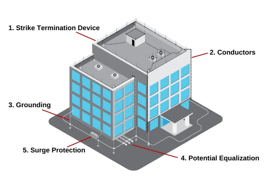 Bonds: Bonding ensures that all metal components and the building's electrical system are at the same electrical potential. This is crucial for preventing a lightning strike from seeking a path through the building's internal systems, which could lead to sparks and potential fires.